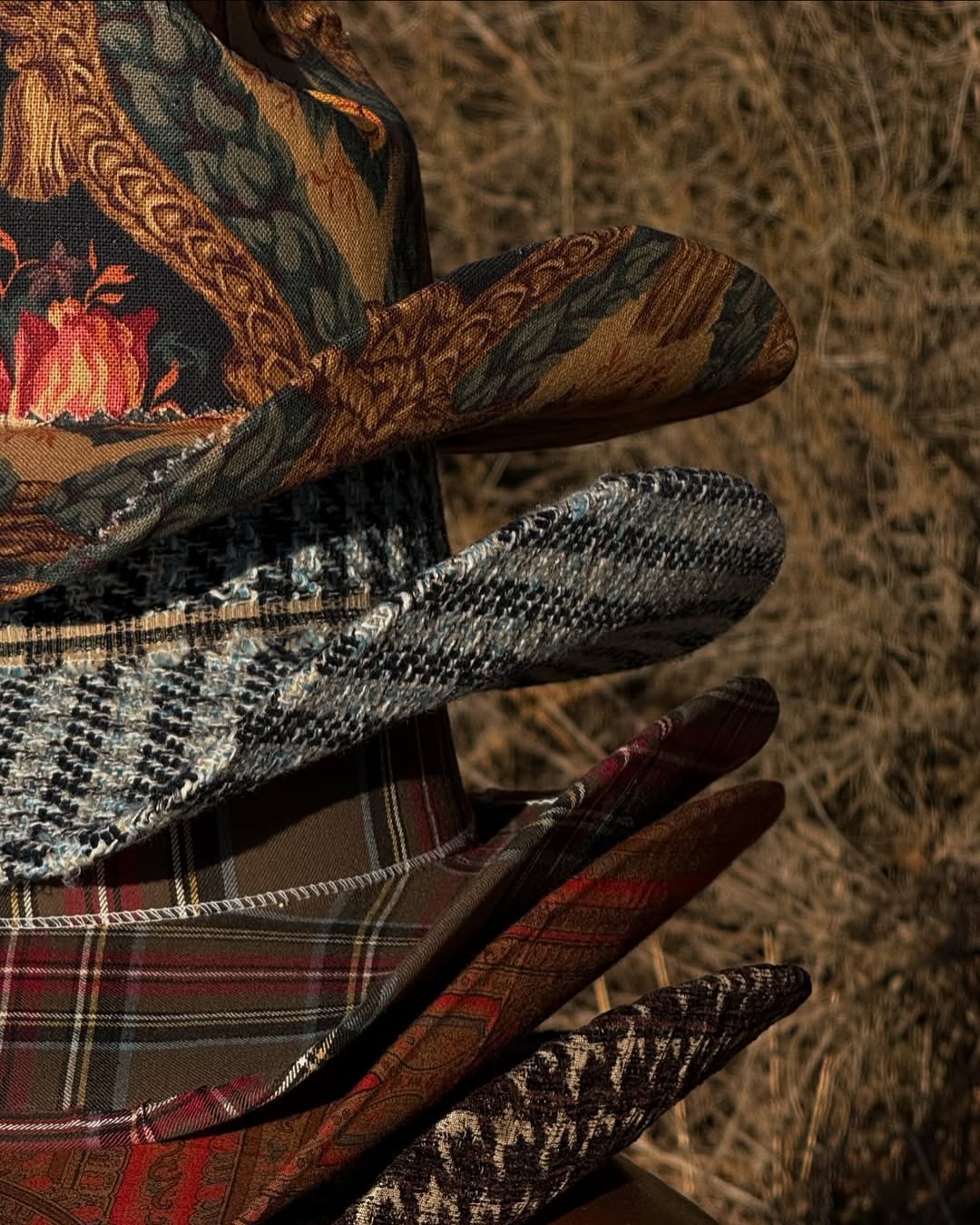 Guided by Lexi Whaley’s creative vision, ZANDRIA merges the timeless allure of the Wild West with an enduring dedication to artistry. With a background in fine art and costume design, Lexi reinvented her craft during industry shutdowns, transitioning from traditional canvases to crafting cowboy hats as wearable art. Inspired by her mother’s lifelong career in interior design, she now upholsters vintage fabrics onto hard canvas hats, honoring the past while redefining Western luxury.