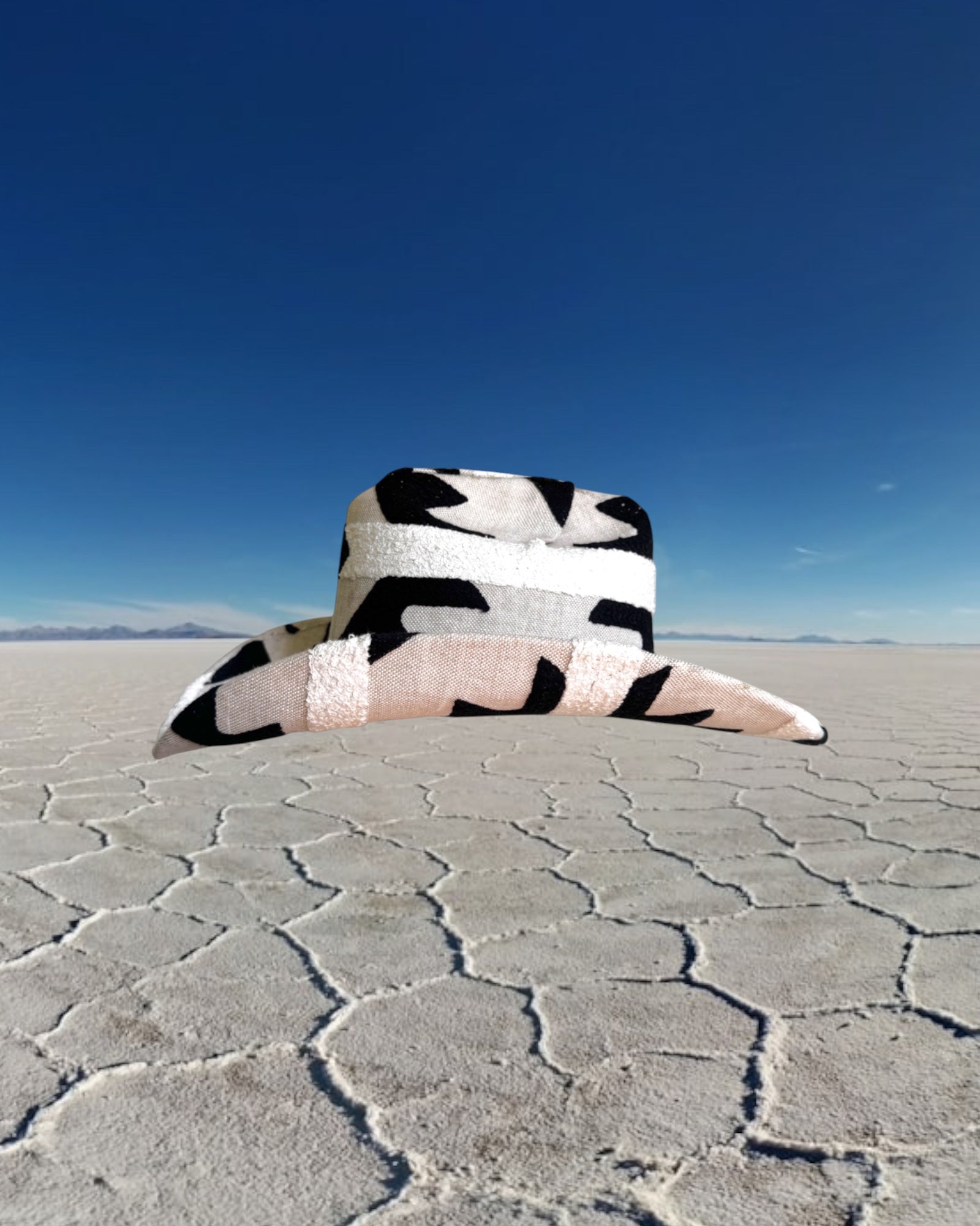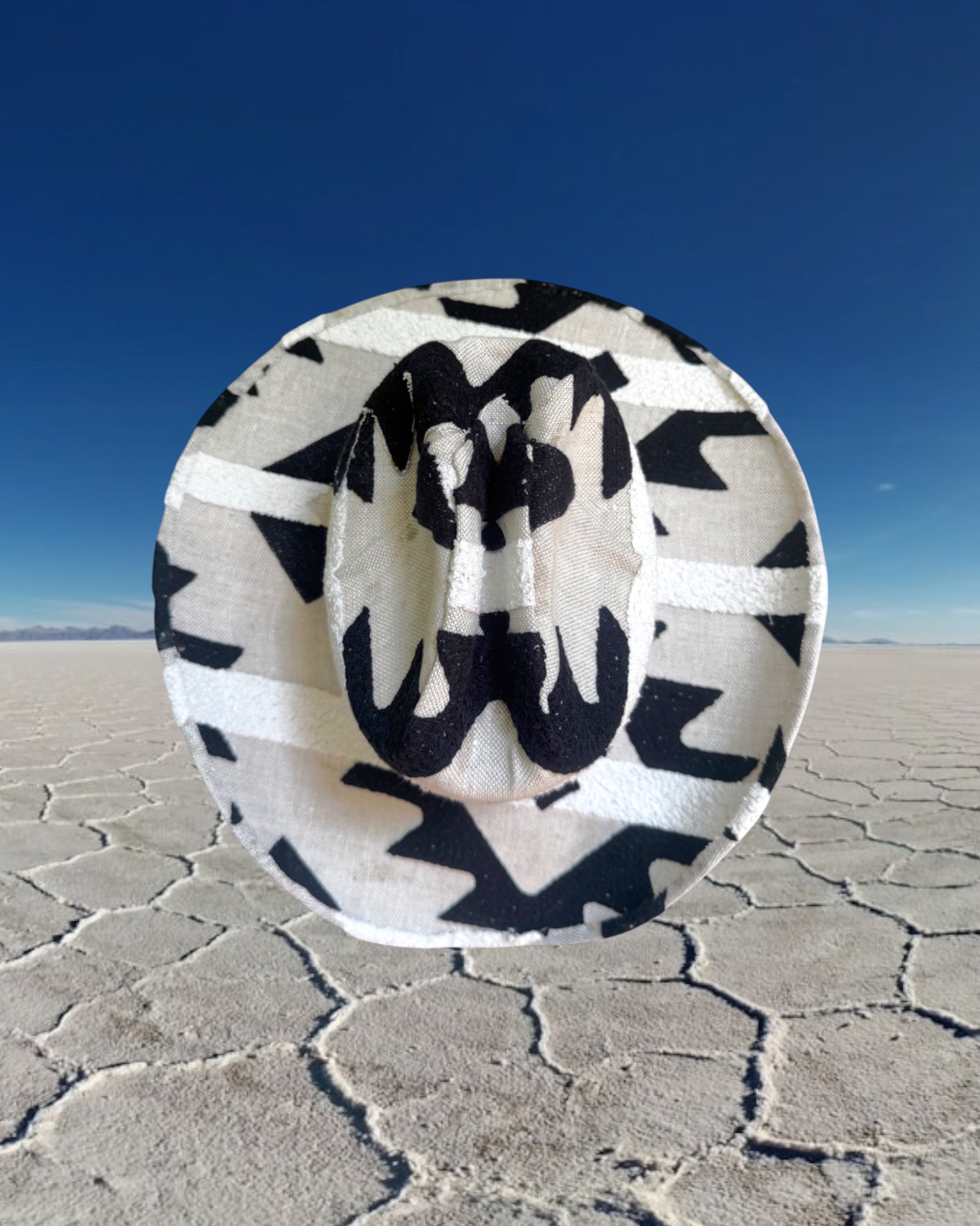 Cut from a bold linen blend, Gila Ghost features striking black-and-white geometrics that echo desert shadows against bright salt flats. Handmade in America, each piece is fully lined with silk and completed with a handmade leather tag.