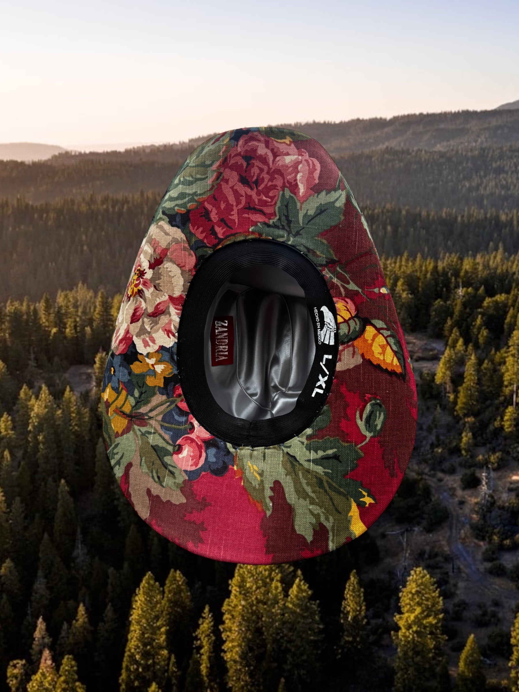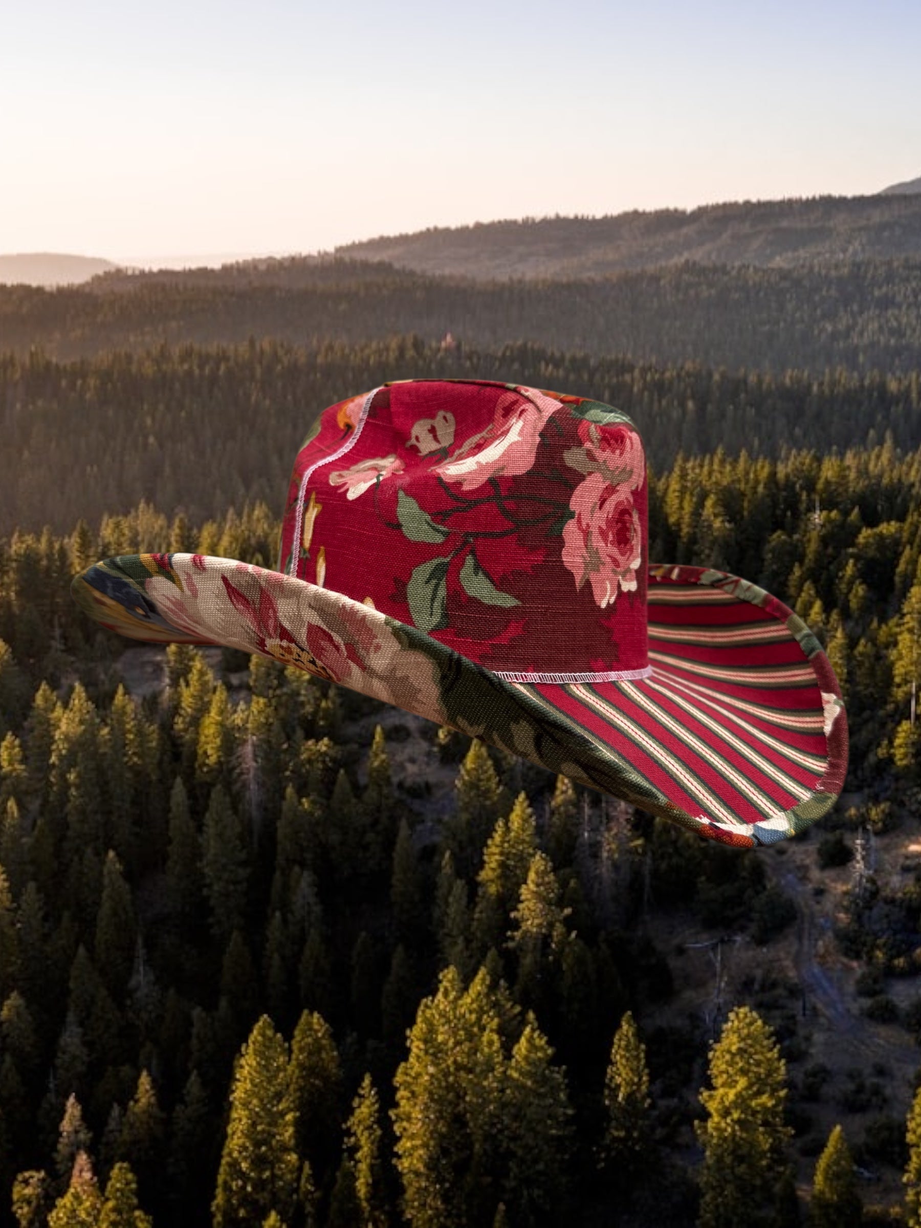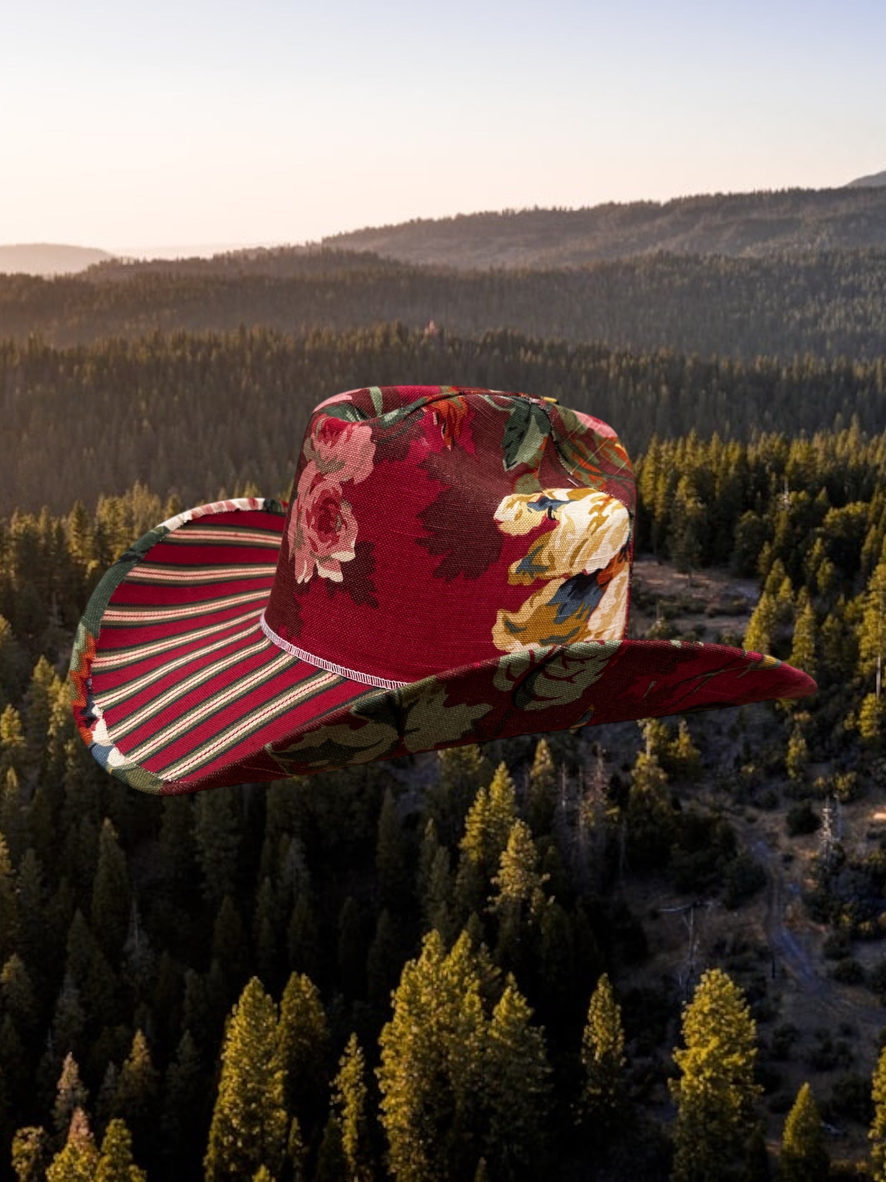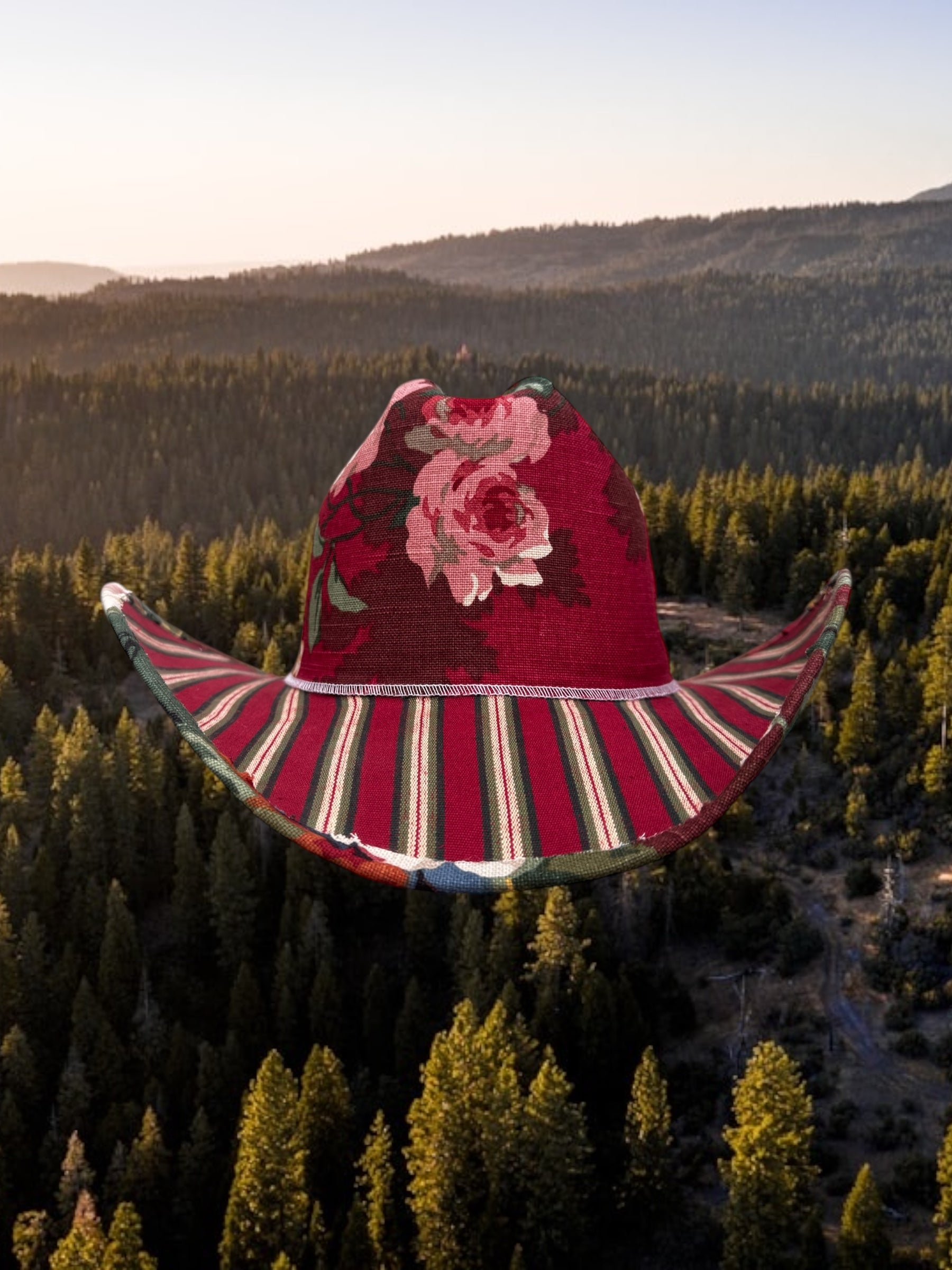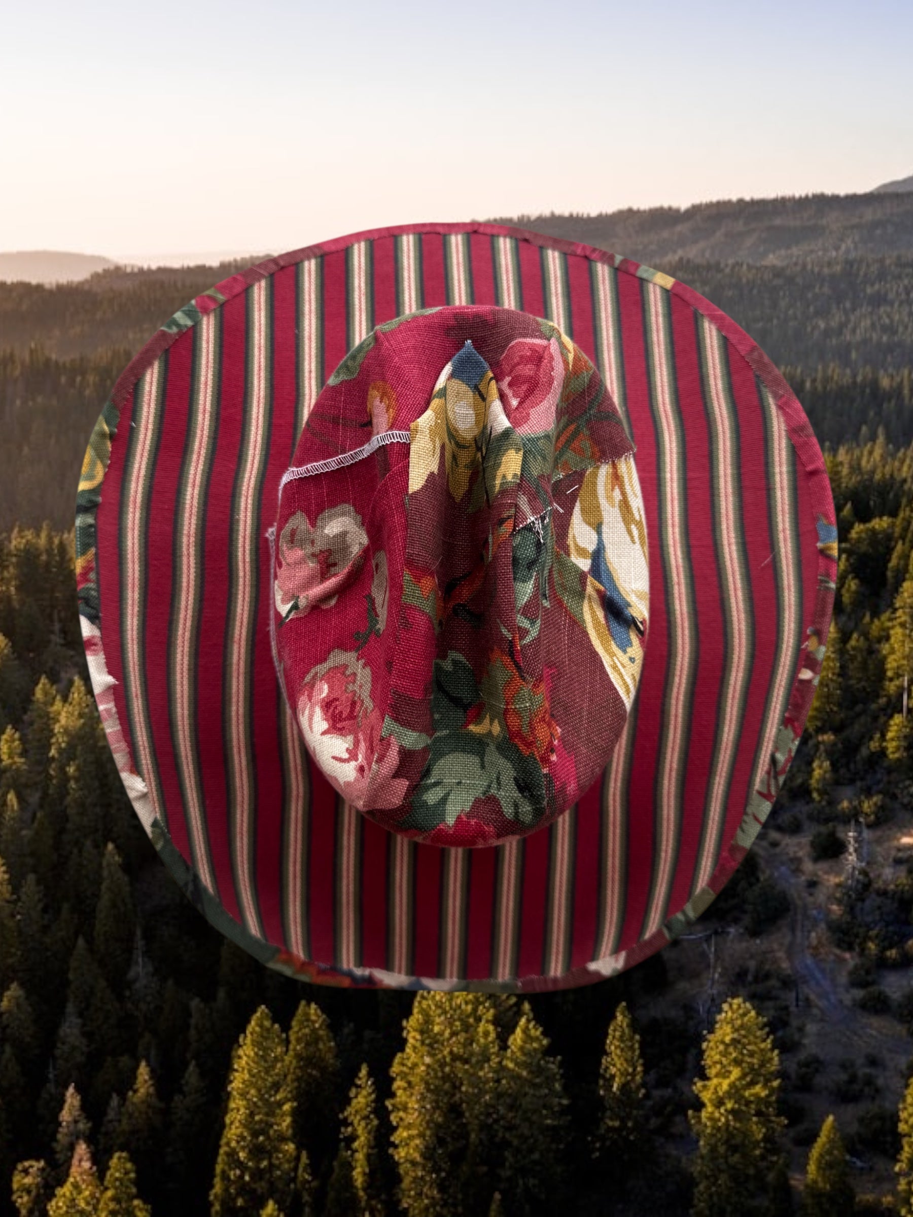 One-of-a-kind fabric-upholstered cowboy hat crafted from rare vintage interior textiles. The crown features an archival floral upholstery, paired with a structured striped ticking brim for contrast and depth. Built on a hard canvas base for lasting shape. Only one available in size L/XL. Handmade in America, it’s finished with a silk liner and handmade leather tag.